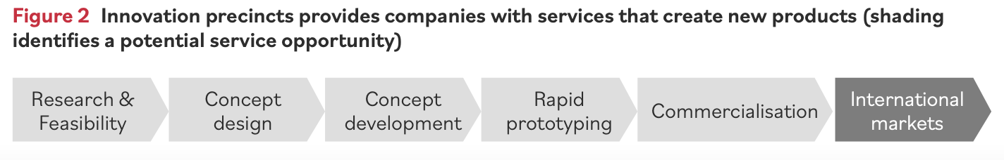 A couple of points about precincts: first, precinct infrastructure does not provide a seamless concept-to-international market path for businesses. It instead gives companies a capabilities-based, problem- solving service organisation to seed innovative sectors like MedTech, biotechnology and pharmaceuticals. Companies in these precincts tend to look for capabilities that can assist them with rapid design, development, validation of products to manage access to Australia’s established R&D infrastructure and high- value skills base. (See Figure 2) Precincts help companies – from start-ups, SME and large corporations – to reduce risk, cost and time-to-market for new products.