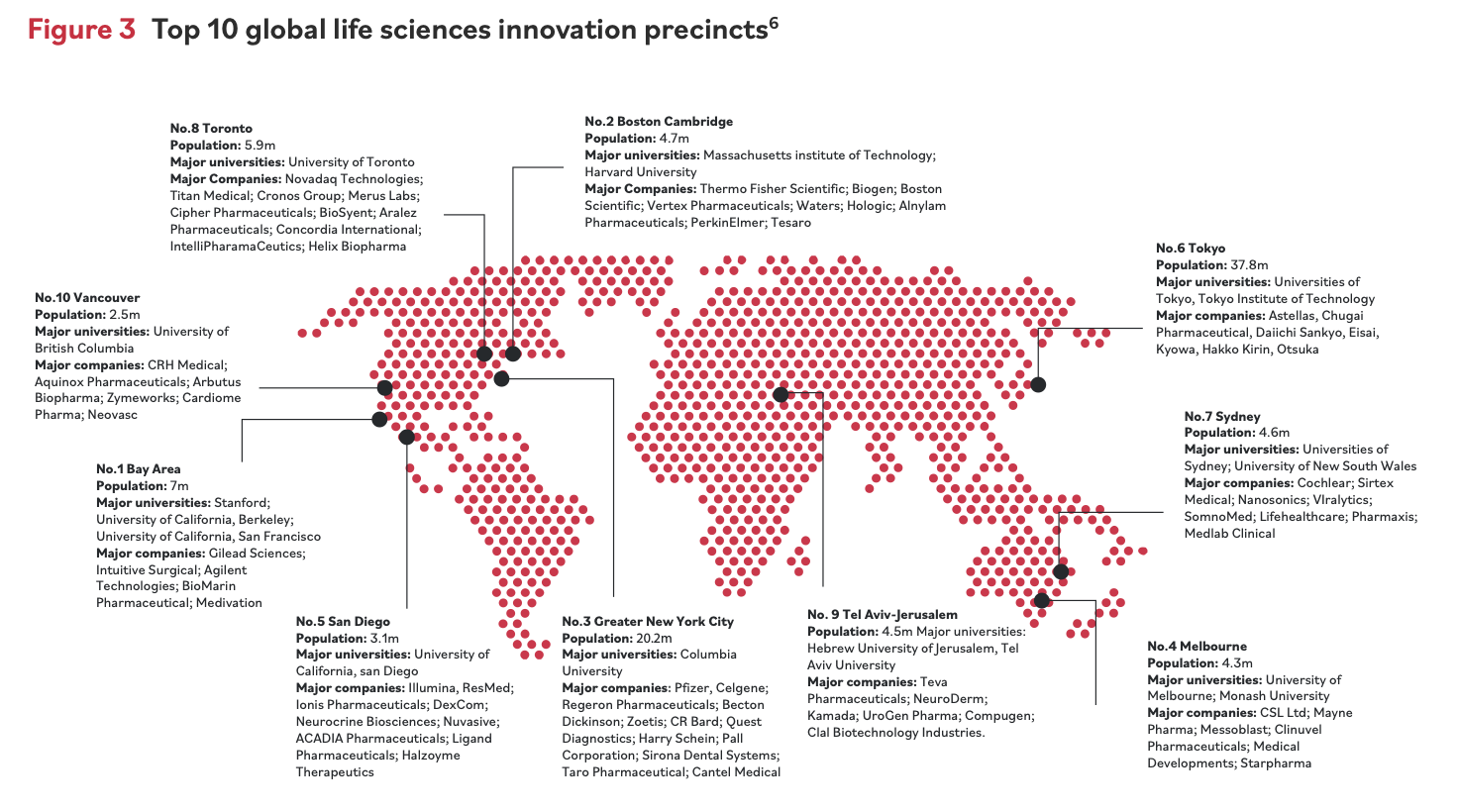 Australia has four of the world’s best 25 life sciences and biomedical innovation clusters – Melbourne (ranked no. 4), Sydney (7), Perth (17), Brisbane (25). The Melbourne Life Sciences cluster is ranked number four in the world after San Francisco, Boston and New York. (See Figure 3)